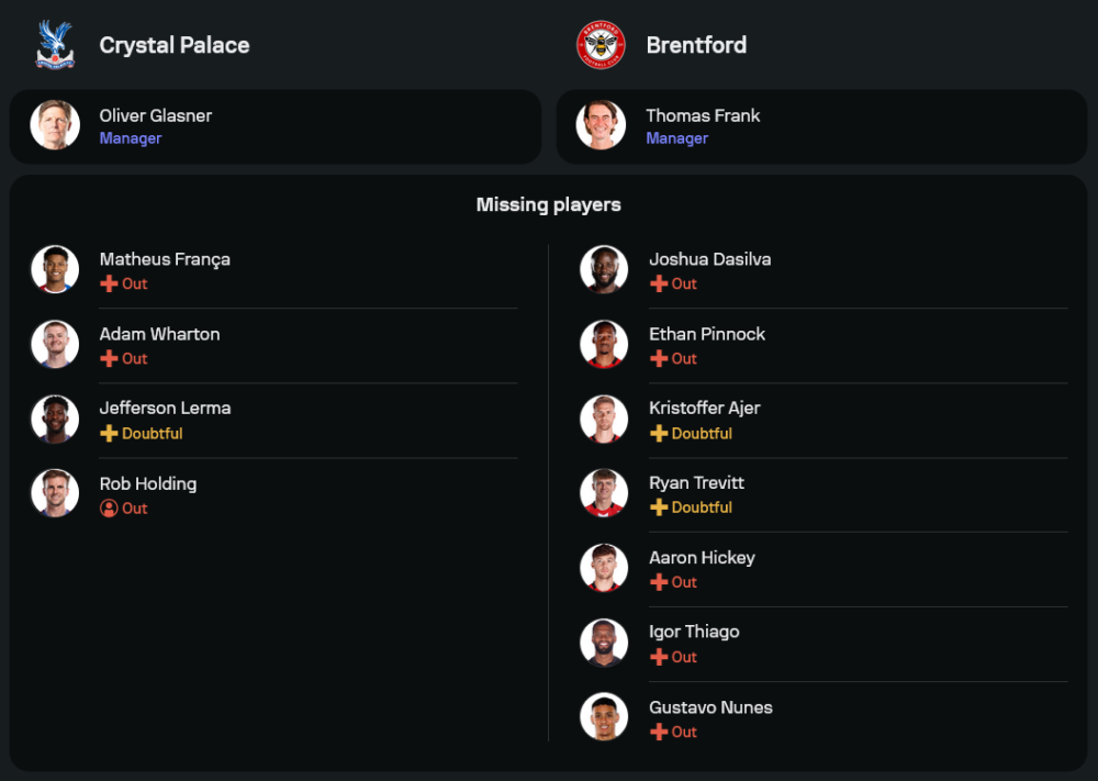 ลูกทีมของ โอลิเวอร์ กลาสเนอร์ ฟอร์มกำลังยอดเยี่ยม หลังจากคว้าชัยถึง 3 จาก 4 นัดหลังสุดแบบไร้พ่าย เกมนี้แม้จะมีปัญหานักเตะบาดเจ็บบางราย อย่าง มาเธอุส ฟรังช่า และ อดัม วาร์ตัน ที่ยังไม่หายดี แต่ตัวหลักที่เหลือพร้อมลงสนาม นำโดย เอเบเรชี่ เอเซ่ เพลย์เมกเกอร์ตัวเก่ง และ ฌ็อง-ฟิลิปเป้ มาเตต้า หัวหอกตัวความหวัง คาดว่าจะลงสนามในระบบ 3-4-2-1