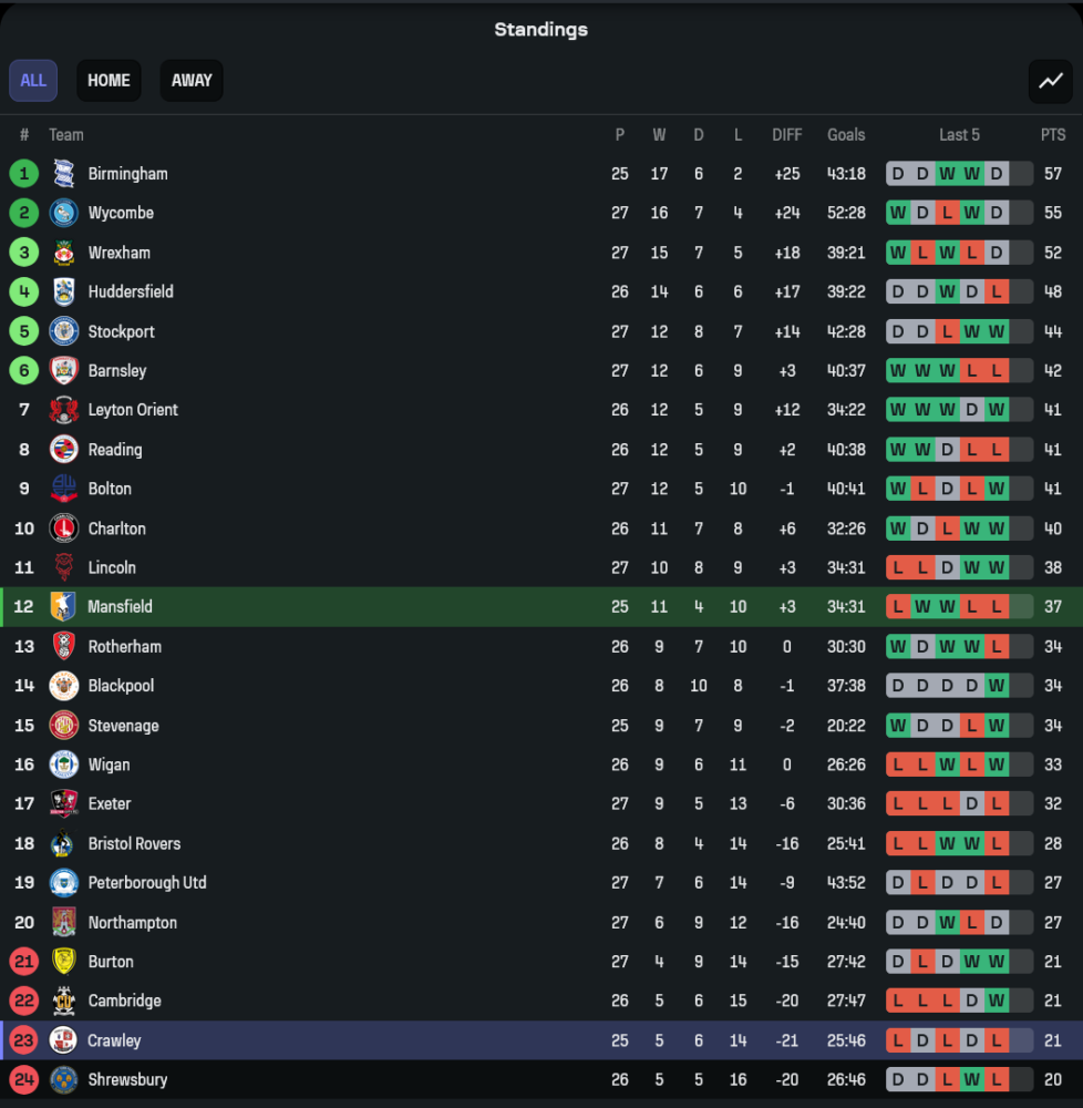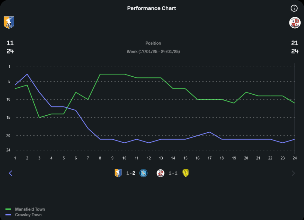 หลังจากเริ่มต้นปีใหม่ด้วยชัยชนะสองเกมติด ฟอร์มของแมนส์ฟิลด์ก็ดิ่งลงเหวทันที พวกเขาแพ้รวด 3 นัดหลังสุด และเสียไปถึง 7 ประตู เกมรับที่เคยแข็งแกร่งเริ่มมีปัญหาชัดเจน เกมในบ้านของพวกเขาถือว่าไม่ได้แย่มากนัก ชนะ 5 จาก 12 นัด แต่ก็เสียประตูค่อนข้างเยอะ