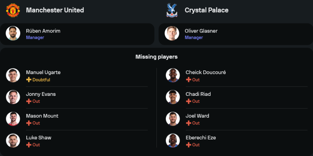 ด้าน คริสตัล พาเลซ แม้จะขาดตัวหลักหลายราย แต่ระบบการเล่นของกลาสเนอร์เน้นความแน่นหนาในเกมรับและสวนกลับเร็ว ซึ่งการมี ฌ็อง-ฟิลิปเป้ มาเตต้า และ อิสไมล่า ซาร์ ในแนวรุกทำให้พวกเขามีอาวุธที่อันตรายในการโจมตีเกมรับของปีศาจแดง