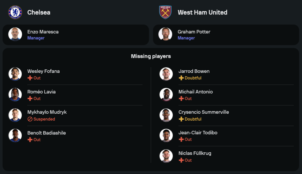 ฝั่งเจ้าบ้าน เชลซี ภายใต้การคุมทีมของ เอนโซ่ มาเรสก้า ต้องเผชิญกับปัญหานักเตะบาดเจ็บหลายราย ไม่ว่าจะเป็น เวสลี่ย์ โฟฟาน่า, เบอนัวต์ บาเดียชิล และ โรเมโอ ลาเวีย ที่ยังคงอยู่ในลิสต์เจ็บ นอกจากนี้พวกเขายังขาด มีไคโล มูดริค ที่ติดโทษแบนด้วย อย่างไรก็ตาม เชลซียังมีขุมกำลังหลักที่พร้อมลงสนามเต็มที่ นำโดย นิโคลัส แจ็คสัน ในแดนหน้า และสามแนวรุกอย่าง โนนี่ มาดูเอเก้, โคล พาลเมอร์ และ เจดอน ซานโช่ ที่พร้อมสร้างความปั่นป่วนให้แนวรับคู่แข่ง