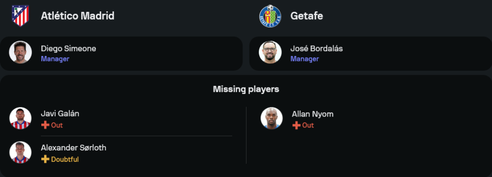 ด้าน เกตาเฟ่ ของ โฆเซ่ บอร์ดาลาส ต้องเผชิญกับปัญหาผู้เล่นบาดเจ็บเช่นกัน โดยไม่มีชื่อของ อลัน เอ็นยอม ที่เจ็บยาว ส่วน เมาโร อารัมบาร์รี ก็ยังไม่พร้อมลงสนาม อย่างไรก็ตาม ขุมกำลังหลักอย่าง บอร์ฆ่า มายอรัล และ คริสตันตุส อูเช่ พร้อมจะลงสนามในแดนหน้า โดยหวังใช้ความสดใหม่และสปีดในการโจมตีแอตเลติโก