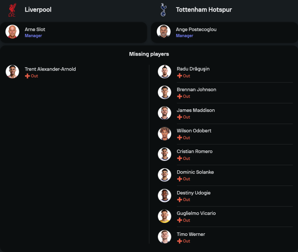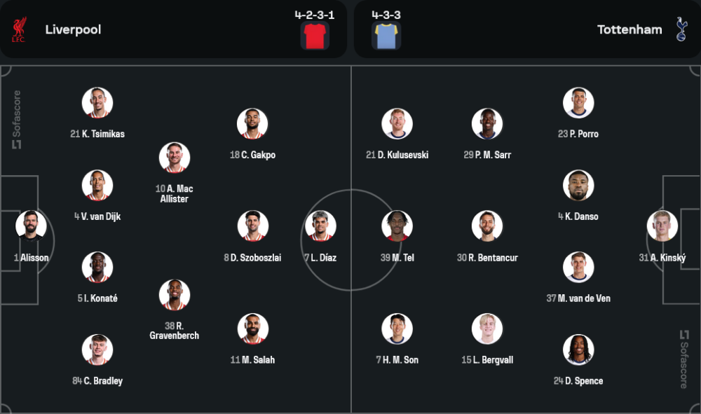 ท็อตแน่ม ฮ็อทสเปอร์: ด้านทีมเยือนของ อังเก้ ปอสเตโคกลู ต้องเผชิญกับปัญหาผู้เล่นบาดเจ็บหลายราย ไม่ว่าจะเป็น เจมส์ แมดดิสัน, คริสเตียน โรเมโร่, ติโม แวร์เนอร์ และ โดมินิก โซลันเก้ อย่างไรก็ตาม สเปอร์สยังมีตัวเก่งอย่าง ซอน ฮึง-มิน, เดยัน คูลูเซฟสกี้ และ โรดริโก้ เบนตานกูร์ ที่พร้อมลงสนามในระบบ 4-3-3 เพื่อลุ้นสร้างเซอร์ไพรส์ในแอนฟิลด์