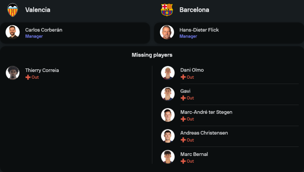 บาร์เซโลน่า: ฝั่งทีมเยือนของ ฮันส์-ดีเทอร์ ฟลิค ต้องเผชิญกับปัญหาผู้เล่นบาดเจ็บหลายราย รวมถึง มาร์ก-อันเดร แตร์ สเตเก้น, ดานี่ โอลโม่, กาบี และ อันเดรียส คริสเตนเซ่น อย่างไรก็ตาม พวกเขายังมีขุมกำลังหลักอย่าง โรเบิร์ต เลวานดอฟสกี้, ราฟินญ่า และ ลามีน ยามาล ที่พร้อมลุยเต็มที่ในเกมนี้