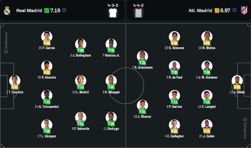 เรอัล มาดริด (4-3-3): ติโบต์ กูร์กตัวส์ – ลูคัส บาสเกซ, ออเรเลียง ชูอาเมนี่, ราอูล อาเซนซิโอ้, ฟราน การ์เซีย – เฟเดริโก้ บัลเบร์เด้, ลูก้า โมดริช, ดานี่ เซบายอส – โรดริโก้, จู๊ด เบลลิ่งแฮม, คิเลียน เอ็มบัปเป้