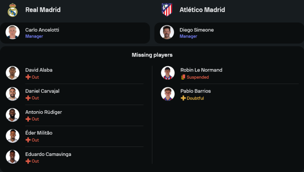 ทีมของ คาร์โล อันเชล็อตติ เจอปัญหาอาการบาดเจ็บเล่นงาน โดยพวกเขาจะไม่มี เอแดร์ มิลิเตา, ดานี่ คาร์บาฆาล, อันโตนิโอ รูดิเกอร์ และ เอดูอาร์โด้ คามาวิงก้า ที่ยังบาดเจ็บอยู่ทั้งหมด ซึ่งส่งผลต่อแนวรับของทีมอย่างมาก อย่างไรก็ตาม เกมรุกของพวกเขายังแข็งแกร่ง นำโดย คิเลียน เอ็มบัปเป้, จู๊ด เบลลิ่งแฮม และ วินิซิอุส จูเนียร์