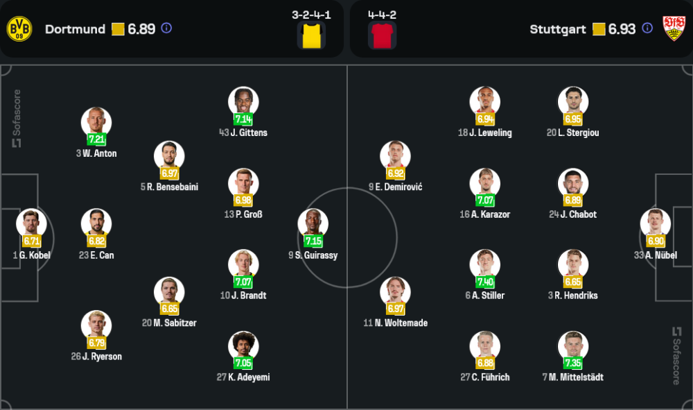ดอร์ทมุนด์ (4-2-3-1) : เกรกอร์ โคเบล – ยูเลี่ยน ไรเออร์สัน, วัลเดมาร์ อันตอน, เอ็มเร่ ชาน, รามี่ เบนเซไบนี่ – ปาสกาล โกร้สส์, มาร์เซล ซาบิตเซอร์ – คาริม อเดเยมี่, ยูเลี่ยน บรันด์ท, เจมี่ บายโน กิตเท่นส์ – เชห์รู กีราสซี่