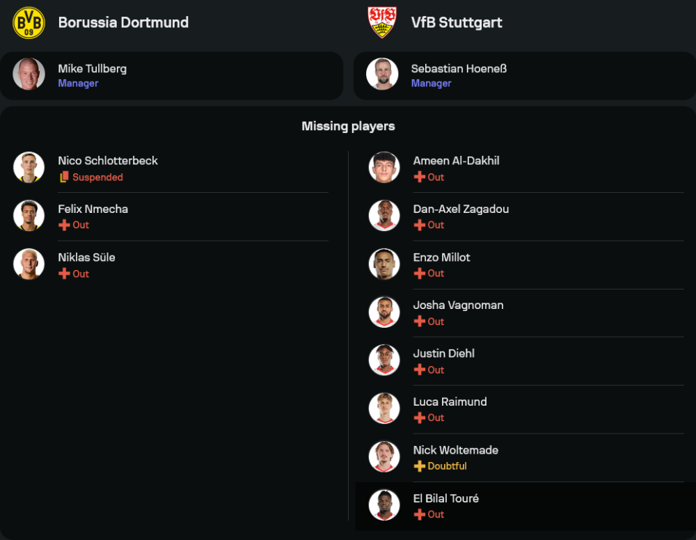 เจ้าบ้านดอร์ทมุนด์ กำลังเริ่มต้นใหม่ภายใต้การคุมทีมของ นิโก้ โควัค แต่เกมนี้ต้องขาด นิโก้ ชล็อตเตอร์เบ็ค แนวรับคนสำคัญที่ติดโทษแบน เช่นเดียวกับ นิคลาส ซูเล่ และ เฟลิกซ์ เอ็นเมชา ที่ยังเจ็บอยู่ แต่ข่าวดีคือแนวรุกอยู่กันครบ เชห์รู กีราสซี่ ยังคงเป็นตัวอันตรายในแดนหน้า พร้อมด้วย จูเลียน บรันด์ท, คาริม อเดเยมี่ และ เจมี่ บายโน กิตเท่นส์ คอยปั้นเกมสนับสนุน