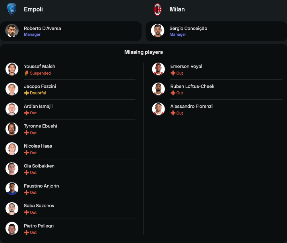 ทีมเยือนเจอปัญหาผู้เล่นขาดหายไปเช่นกัน โดย เซร์คิโอ คอนไซเซา จะไม่มี รูเบน ลอฟตัส-ชีค, เอเมอร์สัน รอยัล และ อเลสซานโดร ฟลอเรนซี่ ที่ยังมีอาการบาดเจ็บ อย่างไรก็ตาม ขุมกำลังหลักอย่าง ราฟาเอล เลเอา, คริสเตียน พูลิซิช และ โอลิวิเยร์ ชิรูด์ ยังพร้อมลงสนาม คาดว่า มิลาน จะยึดแผน 4-3-3 เน้นเกมรุกเข้าใส่เจ้าบ้านตั้งแต่ต้นเกม