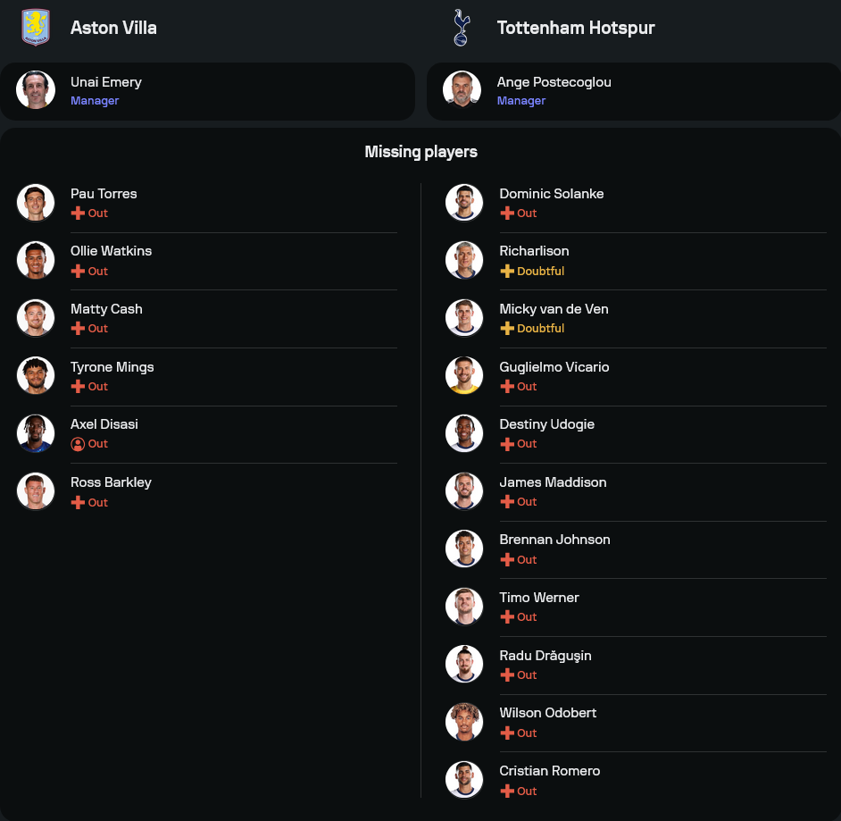 ทางด้าน สเปอร์ส ของ อังเก้ ปอสเตโคกลู เพิ่งโดน ลิเวอร์พูล ถล่มไปถึง 0-4 ในเกมลีกคัพ ทำให้ทีมต้องเร่งเรียกความมั่นใจก่อนเจอ แอสตัน วิลล่า อย่างไรก็ตาม พวกเขาต้องเจอกับปัญหาตัวหลักบาดเจ็บเพียบ ทั้ง โดมินิก โซลันเก้, คริสเตียน โรเมโร่, กูเญลโม่ วิคาริโอ, เดสตินี่ อูโดกี้, เจมส์ แมดดิสัน, ติโม แวร์เนอร์ และ เบรนแน่น จอห์นสัน