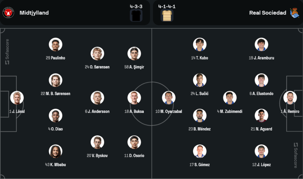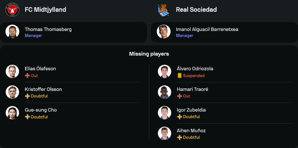 ทีมเยือนจากสเปนไม่มี ฮามารี ตราโอเร่ ที่บาดเจ็บยาว ขณะที่ อิกอร์ ซูเบลเดีย และ อัลบาโร่ โอดริโอโซล่า ต้องรอทดสอบความฟิต แต่ตัวหลักอย่าง ทาเคฟูสะ คูโบะ, บราอิส เมนเดซ และ มิเกล โอยาร์ซาบาล ยังอยู่ครบ พร้อมประสานงานในระบบ 4-1-4-1 หวังบุกมาคว้าชัยกลับออกไปให้ได้