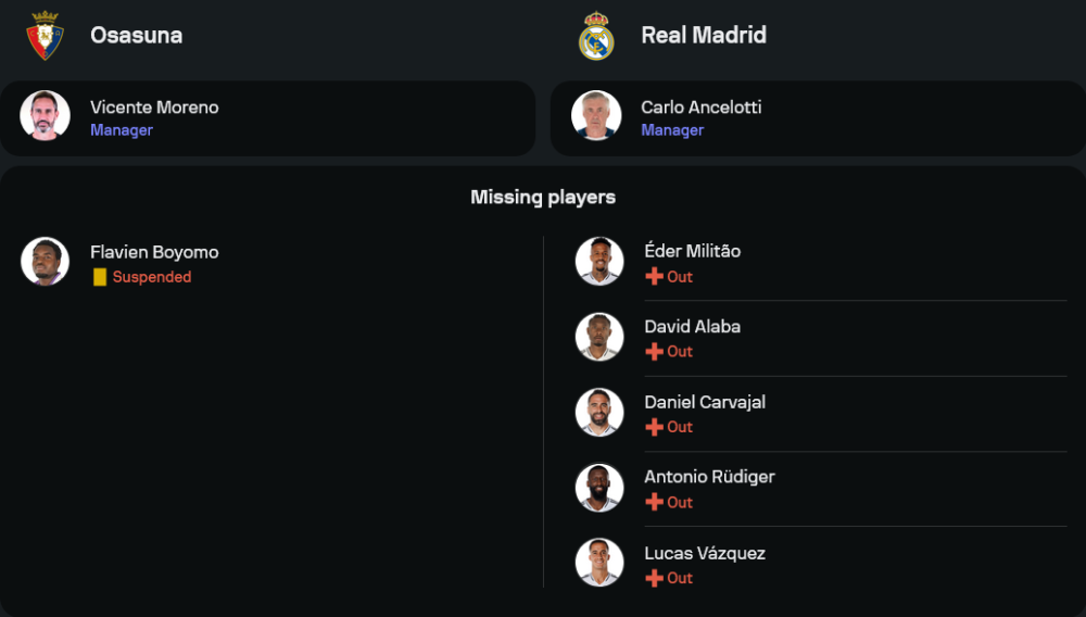ทีมเยือนภายใต้การคุมทีมของ คาร์โล อันเชล็อตติ กำลังอยู่ในช่วงฟอร์มร้อนแรง แม้พวกเขาจะเพิ่งผ่านเกมหนักกับ แมนฯ ซิตี้ มาในศึกยุโรป แต่ทีมก็ยังคงแข็งแกร่ง อย่างไรก็ตาม พวกเขายังคงขาด เอแดร์ มิลิเตา, ดานี่ คาร์บาฆาล, อันโตนิโอ รูดิเกอร์ และ ดาวิด อลาบา ที่ยังไม่หายจากอาการบาดเจ็บ คาดว่าระบบ 4-2-3-1 จะยังคงถูกใช้งาน โดยมี คิเลียน เอ็มบัปเป้ เป็นหัวหอกตัวเป้า พร้อมได้รับการสนับสนุนจาก วินิซิอุส จูเนียร์, จู๊ด เบลลิงแฮม และ โรดริโก้ ในแนวรุก