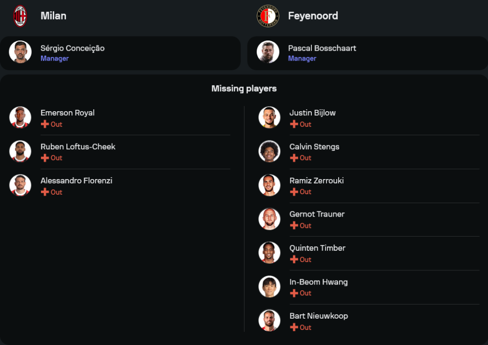เกมนี้มีเดิมพันสูง เอซี มิลาน จะบุกแหลกแน่นอนเพราะพวกเขาต้องการอย่างน้อย 1 ประตูเพื่อกลับสู่เกม แถมการเล่นในบ้านยังเป็นจุดแข็งของพวกเขา ด้าน เฟเยนูร์ด จะมาเน้นตั้งรับและใช้เกมสวนกลับให้เป็นประโยชน์ จุดสำคัญของแมตช์นี้คือ วิเคราะห์บอล แล้วเห็นได้ชัดว่าการขาดตัวหลักหลายคนของทีมเยือนจะส่งผลแน่นอน ในขณะที่ มิลาน ได้เปรียบจากขุมกำลังและเสียงเชียร์ของแฟนบอล