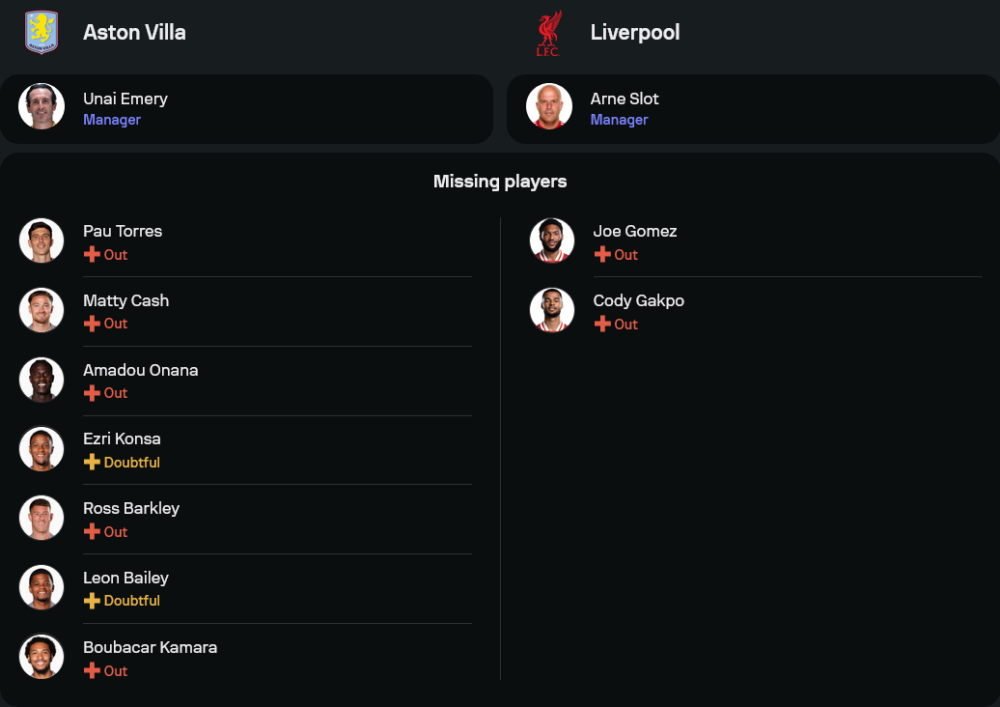 ทีมของ อูไน เอเมรี่ ต้องเจอกับปัญหาผู้เล่นบาดเจ็บหลายราย โดยเฉพาะแนวรับที่ขาด ปาอู ตอร์เรส, แม็ตตี้ แคช, และ บูบาก้าร์ กามาร่า ทำให้ต้องมีการปรับทัพในแดนหลัง คาดว่า ไทโรน มิงส์ และ อั๊กเซล ดิซาซี่ จะต้องรับหน้าที่คุมเกมรับ ขณะที่แดนกลางยังมี ยูรี ตีเลอม็องส์ คอยบัญชาเกม ส่วนแนวรุกจะนำโดย โอลลี่ วัตกิ้นส์ ที่ฟอร์มกำลังร้อนแรง