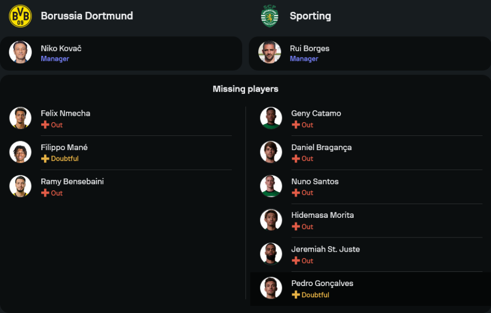 ฝั่งทีมเยือน สปอร์ติ้ง ลิสบอน ของ รุย บอร์เกส ต้องเจอปัญหาหนักหลังจากพ่ายคาบ้าน 0-3 ทำให้ต้องมาลุ้นหนักในเกมเยือนครั้งนี้ พวกเขาจะไม่มี เกนี่ คาตาโม, ดาเนียล บรากันซา, นูโน่ ซานโตส, ฮิเดมาสะ โมริตะ และ เจเรเมียห์ เซนต์-จุสต์ ที่บาดเจ็บทั้งหมด ขณะที่ เปโดร กอนซัลเวส ยังต้องรอเช็กฟิต เกมนี้คาดว่าพวกเขาจะใช้แผน 4-2-3-1 มี วิคเตอร์ โยเคเรส เป็นกองหน้าตัวเป้า