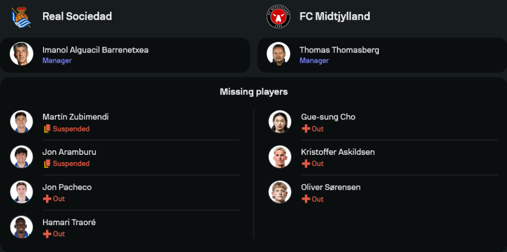 ขุนพลจากแคว้นบาสก์ ภายใต้การนำของ อิมานอล อัลกวาซิล ต้องเจอกับปัญหาผู้เล่นขาดหายไปหลายราย โดย มาร์ติน ซูบิเมนดี้ และ ฆอน อารัมบูรู ติดโทษแบน ขณะที่ ฮามารี่ ตราโอเร่ และ ฆอน ปาเชโก้ ยังอยู่ในช่วงพักฟื้นจากอาการบาดเจ็บ อย่างไรก็ตาม แข้งตัวหลักอย่าง ทาเคฟูสะ คุโบะ, บราอิส เมนเดซ และ มิเกล โอยาร์ซาบาล พร้อมลงสนามในระบบ 4-3-3 ซึ่งจะเป็นแท็กติกที่เปิดเกมรุกเต็มตัวเพื่อหวังปิดบัญชีในบ้านของตัวเอง