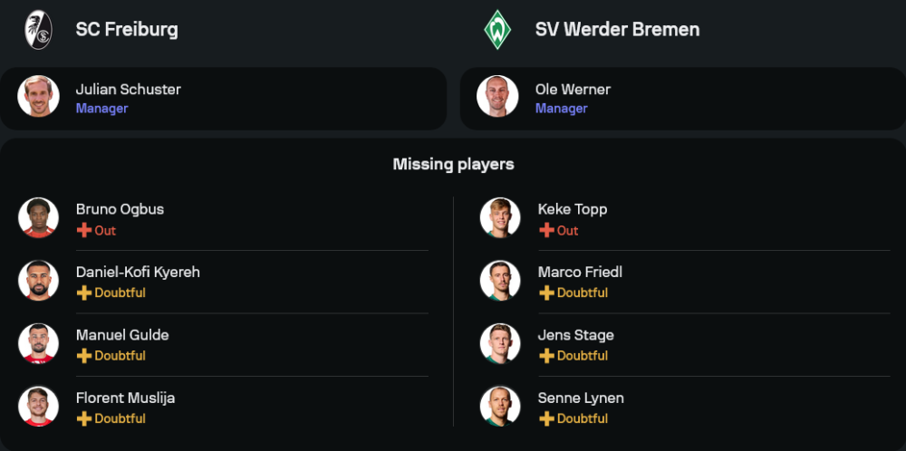 เจ้าถิ่นภายใต้การนำของ ยูเลี่ยน ชูสเตอร์ ฟอร์มกำลังเข้าฝัก คว้าชัย 3 นัดรวดแบบไม่เสียประตู ขณะที่ความพร้อมของทีมก่อนเกมนี้ พวกเขาต้องเช็กฟิต ดาเนี่ยล-โคฟี เคเรห์, มานูเอล กุลเด และ ฟลอเรนท์ มุสลิจา ส่วน บรูโน่ อ็อกบัส พลาดลงสนามแน่นอน อย่างไรก็ตาม กำลังหลักของทีมยังอยู่กันครบ โดยมี ลูคัส โฮเลอร์ ยืนหน้าเป้า และ วิเชนโซ่ กริโฟ่ คอยปั้นเกมในระบบ 4-2-3-1