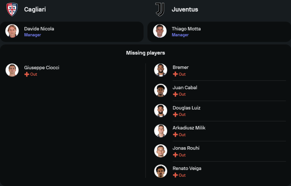 ทีมเยือนของ ติอาโก้ ม็อตต้า มีปัญหาผู้เล่นบาดเจ็บหลายราย ทั้ง เบรเมอร์, ฮวน กาบาล, ดั๊กลาส ลุยซ์ และ อาร์คาดิอุส มิลิค แต่ข่าวดีคือแนวรุกยังอยู่กันครบ โดย ร็องดัล โคโล่ มูอานี่ ยังคงเป็นตัวความหวังในแดนหน้า พร้อมมี เคนาน ยิลดิซ และ ฟรานซิสโก้ คอนไซเซา คอยสนับสนุน