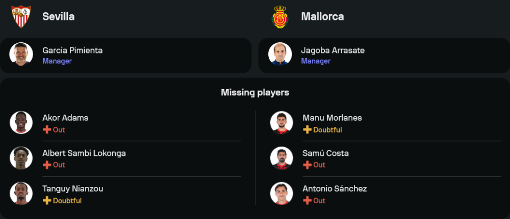 เจ้าถิ่นภายใต้การนำของ การ์เซีย ปิมิเอนต้า ต้องเจอปัญหานักเตะเจ็บบ้างเล็กน้อย โดยเฉพาะแนวรับ ต็องกีย์ เนียนซู ที่ยังต้องรอเช็กความฟิต ขณะที่ อัลเบิร์ต แซมบี้ โลกอนก้า หมดสิทธิ์ลงช่วยทีมแน่นอน อย่างไรก็ตาม เซบีย่าจะได้แนวรับตัวหลัก โลอิก บาเด้ กลับมา พร้อมวางเกมรุกแบบเต็มสูบ โดยมี โดดี้ ลูเกบาคิโอ, อิสซัก โรเมโร่ และ รูเบน วาร์กัส เป็นสามประสานแดนหน้า