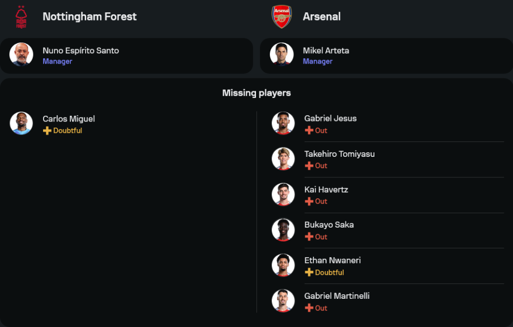 ทีมของ มิเกล อาร์เตต้า ฟอร์มยังคงไม่แน่นอน หลังเพิ่งพ่ายให้กับ เวสต์แฮม 0-1 ในบ้านตัวเอง เกมนี้พวกเขายังขาดตัวหลักหลายราย กาเบรียล เฮซุส, ทาเคฮิโระ โตมิยาสุ, ไค ฮาแวร์ตซ์, บูกาโย่ ซาก้า และ กาเบรียล มาร์ติเนลลี่ หมดสิทธิ์ช่วยทีมแน่นอน ขณะที่ อีธาน เอ็นวาเนรี ยังต้องรอเช็คความฟิต ทำให้แดนหน้าจะเป็น เลอันโดร ทรอสซาร์ นำทัพในระบบ 4-3-3