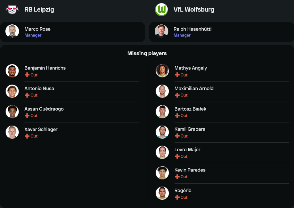 ทางฝั่ง ราล์ฟ ฮาเซ่นฮุตเทิ่ล ก็มีปัญหาผู้เล่นบาดเจ็บเพียบ ทั้ง คามิล กราบาล่า, โรเจริโอ้, มาซิมิเลี่ยน อาร์โนลด์, ลอฟโร่ เมเยอร์, เควิน พาเรเดส และ บาร์ตอสซ์ เบียเล็ค ทำให้ตัวเลือกแนวรับลดลงไปมาก อย่างไรก็ตาม ทีมยังมี โยนาส วินด์ และ โมฮาเหม็ด อามูร่า เป็นคู่กองหน้าที่พร้อมทะลวงแนวรับคู่แข่งในระบบ 4-4-2