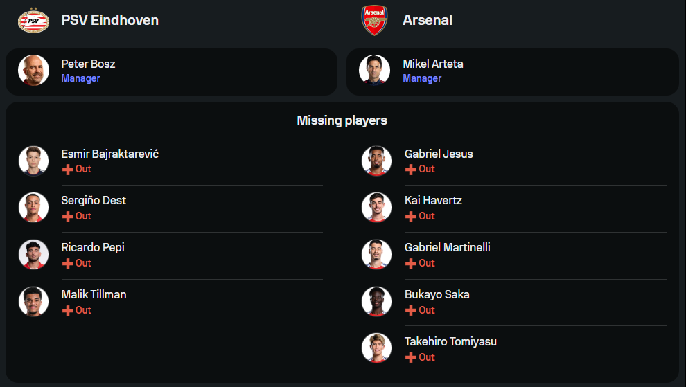 พีเอสวี ทีมของ ปีเตอร์ บอสซ์ มีปัญหาผู้เล่นบาดเจ็บหลายราย โดย เอสมีร์ บายรัคตาเรวิช, มาลิก ทิลล์แมน, ริคาร์โด้ เปปิ และ เซร์จิโญ่ เดสต์ ต่างหมดสิทธิ์ลงสนาม อย่างไรก็ตาม แกนหลักที่เหลือยังพร้อมลุย นำโดย ลุค เด ยอง ศูนย์หน้าตัวความหวัง ขนาบข้างด้วย โยฮัน บากาโยโก้ และ อิวาน เปริซิช ที่พร้อมปั่นป่วนแนวรับอาร์เซน่อล