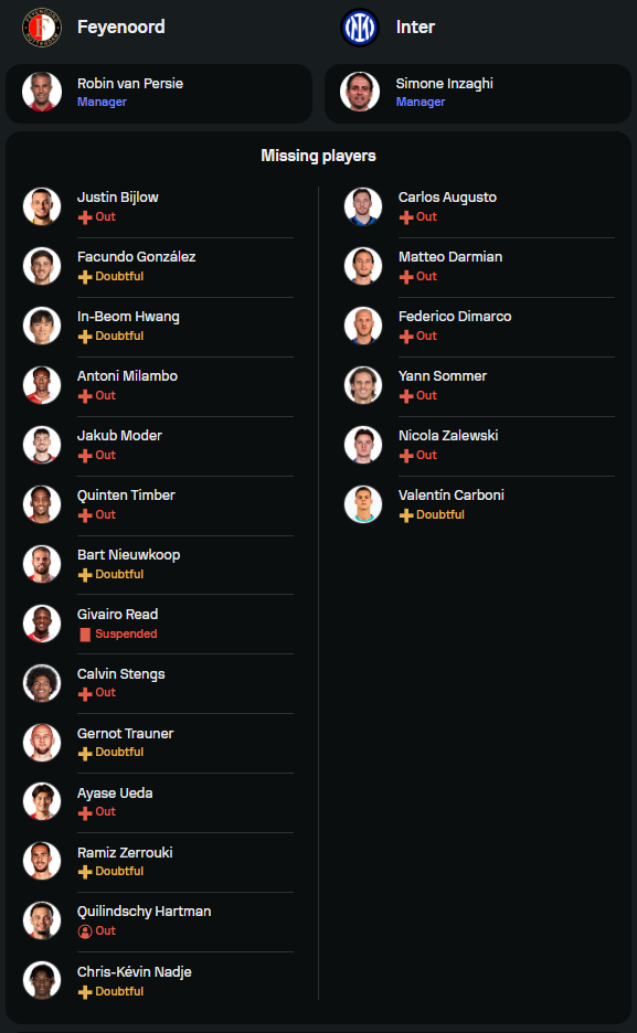 อินเตอร์ มิลาน ทีมเยือนจากอิตาลี ภายใต้การนำของ ซิโมเน่ อินซากี้ ยังคงแข็งแกร่ง แม้จะขาดตัวหลักบางราย เช่น นิโคลา ซาเลฟสกี้, มัตเตโอ ดาร์เมี่ยน, ยานน์ ซอมเมอร์ และ คาร์ลอส ออกุสโต ที่มีอาการบาดเจ็บ ส่วน เฟเดริโก้ ดิมาร์โก้ และ ฮาคาน ชัลฮาโนลู ยังต้องรอเช็คความฟิต แต่แนวรุกยังนำโดย เลาตาโร่ มาร์ติเนซ และ มาร์คุส ตูราม ที่พร้อมลงสนาม