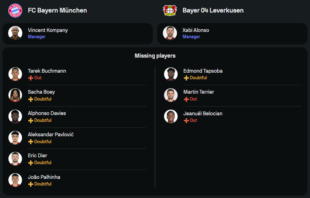 บาเยิร์น มิวนิค ทัพ “เสือใต้” ภายใต้การนำของ แว็งซ็อง ก็อมปานี จะต้องเช็คความฟิตของ โยชัว คิมมิช ที่เริ่มกลับมาซ้อมได้แล้ว รวมถึง อัลฟอนโซ่ เดวีส์, ชูเอา ปาลินญ่า, อเล็กซานดาร์ พาฟโลวิช และเอริค ดายเออร์ ที่อาจยังไม่พร้อมช่วยทีม ขณะที่แนวรุกยังคงวาง แฮร์รี่ เคน เป็นหัวหอกตัวเป้า โดยมี คิงส์ลี่ย์ โกมัน, ยามาล มูเซียล่า และ ไมเคิ่ล โอลิเซ่ เป็นตัวปั้นเกม