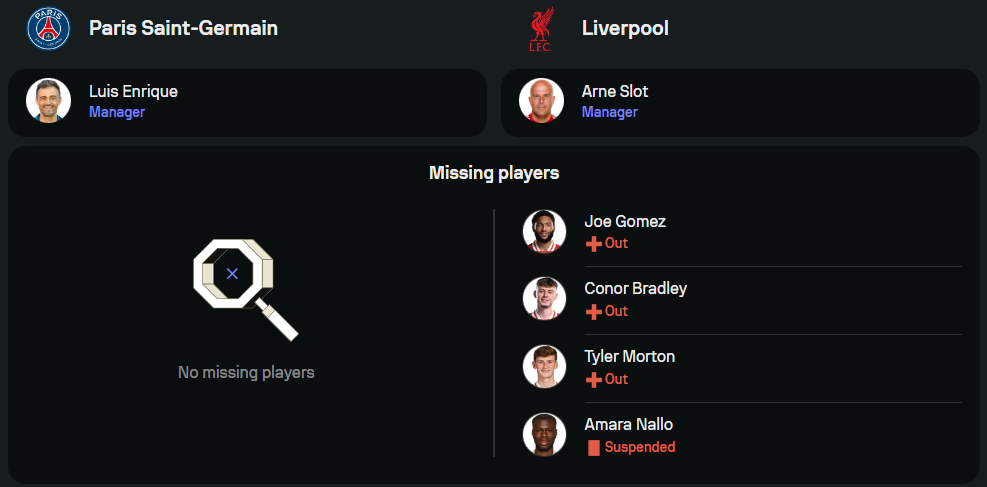 ปารีส แซงต์ แชร์กแมง เจ้าถิ่น เปแอสเช ของกุนซือ หลุยส์ เอ็นริเก้ ยังคงอยู่ในฟอร์มที่ยอดเยี่ยมและไม่มีปัญหาผู้เล่นบาดเจ็บเพิ่มเติม เกมนี้พร้อมส่งชุดที่แข็งแกร่งที่สุดลงสนาม โดยคีย์แมนอย่าง วิตินญ่า, ควิช่า ควารัตสเคเลีย และ วิลเลี่ยน ปาโช ที่ได้พักจากเกมลีกล่าสุด จะกลับมาสตาร์ทเป็นตัวจริง ส่วนแนวรุกยังคงวางใจ แบร๊ดลีย์ บาร์โคล่า, ควารัตสเคเลีย และ อุสมัน เดมเบเล่ เป็นสามประสานตัวความหวังในการทะลวงแนวรับของทีมเยือน