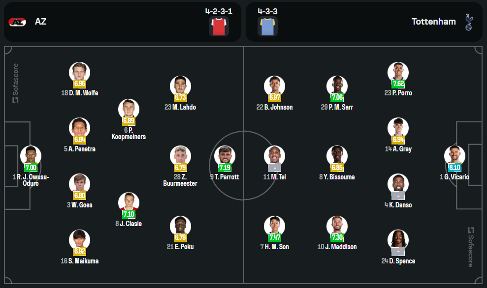 ท็อตแน่ม ฮ็อตสเปอร์ อังเก้ ปอสเตโคกลู ต้องเจอปัญหาหนักเมื่อตัวหลักหลายคนลงสนามไม่ได้ เดยาน คูลูเซฟสกี้, ริชาร์ลิซอน, ติโม แวร์เนอร์ และ ราดู ดรากูซิน ต่างมีอาการบาดเจ็บ ขณะที่ เบน เดวีส์ และ โดมินิค โซลันกี้ ต้องรอเช็คความฟิต แต่ข่าวดีคือ ซอน ฮึง-มิน และ เจมส์ แมดดิสัน ฟิตเต็มร้อย พร้อมนำทัพในแผน 4-3-3 โดยมี เบรนแน่น จอห์นสัน และ มาติส แตล เป็นตัวสนับสนุนแนวรุก