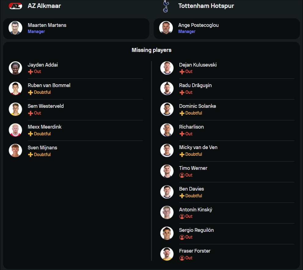 อาแซ่ด อัลค์มาร์ ทีมของ มาร์เท่น มาร์เท่นส์ มีปัญหาผู้เล่นบาดเจ็บหลายราย โดย เจย์เด้น แอดได และ เซม เวสเตอร์เวลด์ หมดสิทธิ์ลงสนามแน่นอน ขณะที่ เม็กซ์ เมอร์ดิงค์, รูเบน ฟาน บอมเมล และ สเวน ไมย์นานส์ ยังต้องรอเช็คความฟิตก่อนเกม การจัดทัพคาดว่าจะมาในระบบ 4-2-3-1 พร้อมส่ง ทรอย แพร์ร็อตต์ ดาวยิงตัวเก่งลงล่าตาข่าย โดยมี ซิโก้ บูร์มีสเตอร์ และ เออร์เนสต์ โปคู สนับสนุนเกมรุกจากด้านหลัง