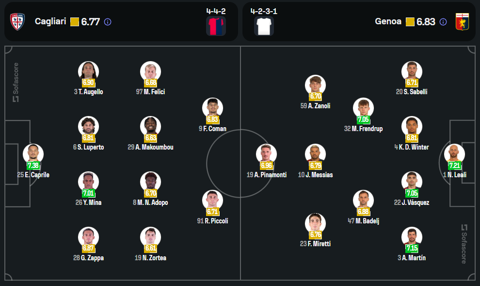 เจนัว (4-2-3-1) : นิโกล่า เลอาลี่ – สเตฟาโน ซาเบลลี, โคนี เดอ วินเทอร์, โฆอัน บัสเกซ, อารอน มาร์ติน – มิลาน บาเดลจ์, มอร์เท่น เฟรนดรุ๊ป – อเลสซานโดร ซาโนลี่, จูเนียร์ เมสซิอาส, ฟาบิโอ มิเรตติ – อันเดรีย ปินามอนติ