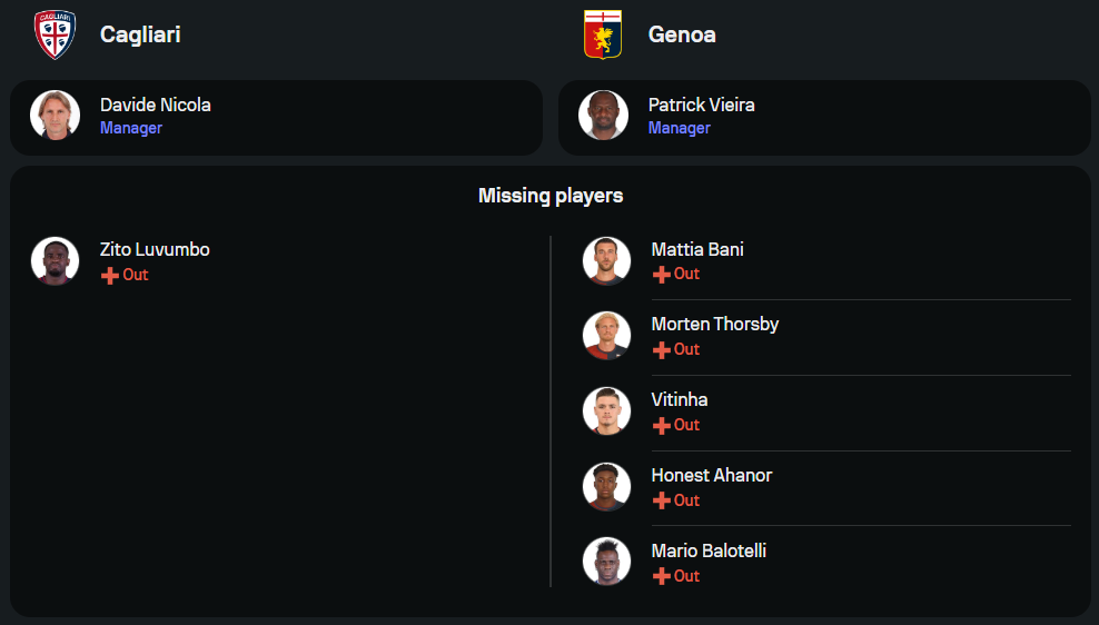 เจนัว ทางฝั่งของ ปาทริค วิเอร่า กุนซือของเจนัว ทีมต้องขาด มัตเตีย บานี่, มอร์เทน ธอร์สบี้, วิตินญ่า, ฮอร์เนสต์ อาฮานอร์ และ มาริโอ บาโลเตลลี่ ที่มีปัญหาบาดเจ็บ อย่างไรก็ตาม นักเตะตัวหลักอย่าง อันเดรีย ปินามอนติ และ จูเนียร์ เมสซิอาส ยังอยู่กันครบ คาดว่าจะมาในระบบ 4-2-3-1 เน้นการครองบอลและกดดันเจ้าถิ่นให้ผิดพลาด