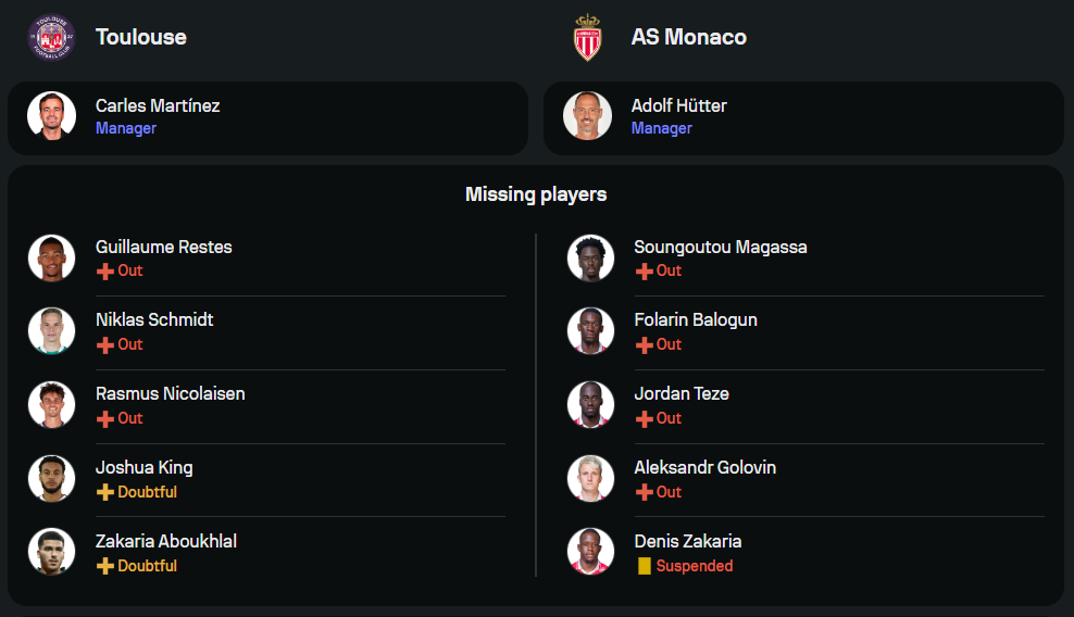 ตูลูส ทีมของ การ์เลส มาร์ติเนซ โนเวล เพิ่งโชว์ฟอร์มสุดโหดด้วยการบุกถล่ม อองเช่ร์ 4-0 แต่ยังมีปัญหาต้องเช็คฟิตของ โจชัว คิง และ ซากาเรีย อบูคาล ที่เป็นกำลังหลักในแนวรุก นอกจากนี้ยังขาด กิโยม เรสต์, ราสมุส นิโคไลเซ่น และ นิคลาส ชมิดท์ ที่ยังบาดเจ็บ คาดว่าจะใช้ระบบ 3-4-3 โดยมี ชาวี่ บาบิคก้า, ฟรองก์ มากรี และ อารอน ดอนนุม เป็นตัวรุก