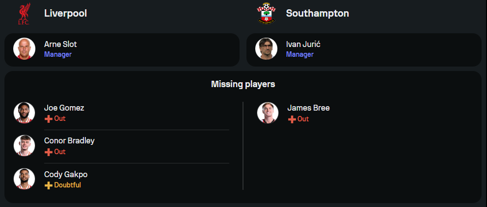 ลูกทีมของ อาร์เน่ สล็อต กำลังอยู่ในฟอร์มที่ยอดเยี่ยม หลังเพิ่งบุกไปเอาชนะ ปารีส แซงต์ แชร์กแมง 1-0 ในศึก ยูฟ่า แชมเปี้ยนส์ ลีก แถมเกมลีกก็กำลังร้อนแรง โดยปัญหาหลักของทีมยังคงเป็นอาการบาดเจ็บของ โจ โกเมซ และ คอเนอร์ แบรดลีย์ ส่วน โคดี้ กั๊คโป ต้องรอเช็คความฟิต ขณะที่ผู้เล่นตัวหลักอย่าง โมฮาเหม็ด ซาล่าห์, ดาร์วิน นูนเญซ และ เทรนต์ อเล็กซานเดอร์-อาร์โนลด์ พร้อมลุยเต็มสูบ