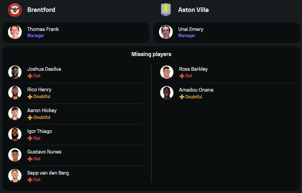 เบรนท์ฟอร์ด เจ้าถิ่น เบรนท์ฟอร์ด ของกุนซือ โธมัส แฟรงค์ จะต้องรับมือกับปัญหาผู้เล่นบาดเจ็บหลายราย ไม่ว่าจะเป็น โจชัว ดาซิลวา, อิกอร์ ธิอาโก้, กุสตาโว่ นูเนส และ เซ็ป ฟาน เด็น เบิร์ก ที่หมดสิทธิ์ลงสนามแน่นอน รวมถึง ริโก้ เฮนรี่ และ อารอน ฮิคกี้ย์ ที่ยังต้องรอเช็กความฟิต อย่างไรก็ตามแนวรุกยังมี โยแอน วิสซ่า, บรีย็อง เอ็มโบโม่ และ เควิน เชด เป็นตัวความหวังในการทำลายแนวรับคู่แข่ง