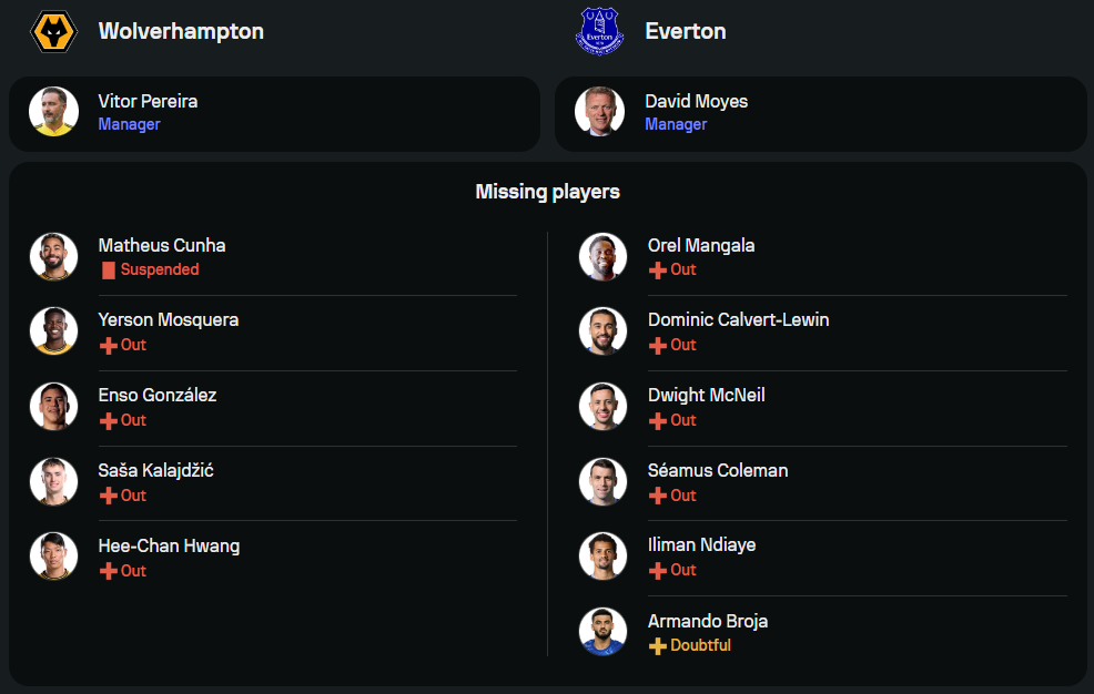 วูล์ฟส์ของ วิตอร์ เปไรร่า กำลังเจอปัญหาหนัก เพราะขาด มาเธอุส คุนญ่า ที่ติดโทษแบน และยังมีผู้เล่นบาดเจ็บหลายราย รวมถึง เยร์สัน มอสเกอร่า, เอ็นโซ่ กอนซาเลซ, ซาซ่า คาลายด์ซิช และ ฮวาง ฮี-ชาน ซึ่งทั้งหมดเป็นกำลังหลัก อย่างไรก็ตาม พวกเขายังมี ยอร์เก้น สตรานด์ ลาร์เซ่น คอยเป็นตัวทีเด็ดในแนวรุก โดยมี ปาโบล ซาราเบีย และ ฌ็อง-ริกเนอร์ เบลล์การ์ด สนับสนุนเกมรุก