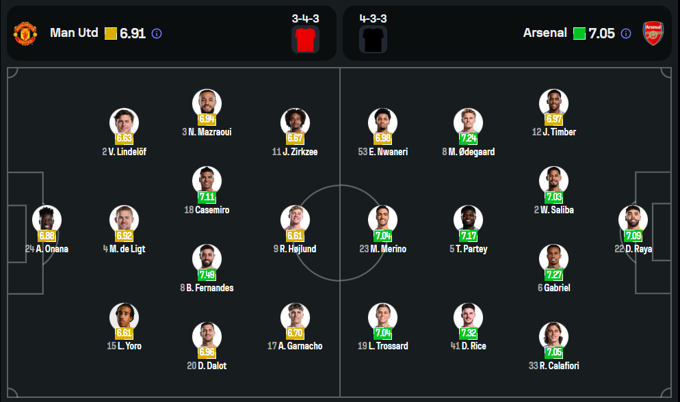 อันเดร โอนาน่า – เลนี่ โยโร่, มัตไธจ์ส เด ลิกต์, วิกเตอร์ ลินเดอเลิฟ – นูสแซร์ มาซราอุย, บรูโน่ แฟร์นานเดส, คาเซมิโร่, ดิโอโก้ ดาโลต์ – อเลฮานโดร การ์นาโช่, โจชัว เซิร์คซี – ราสมุส ฮอยลุนด์