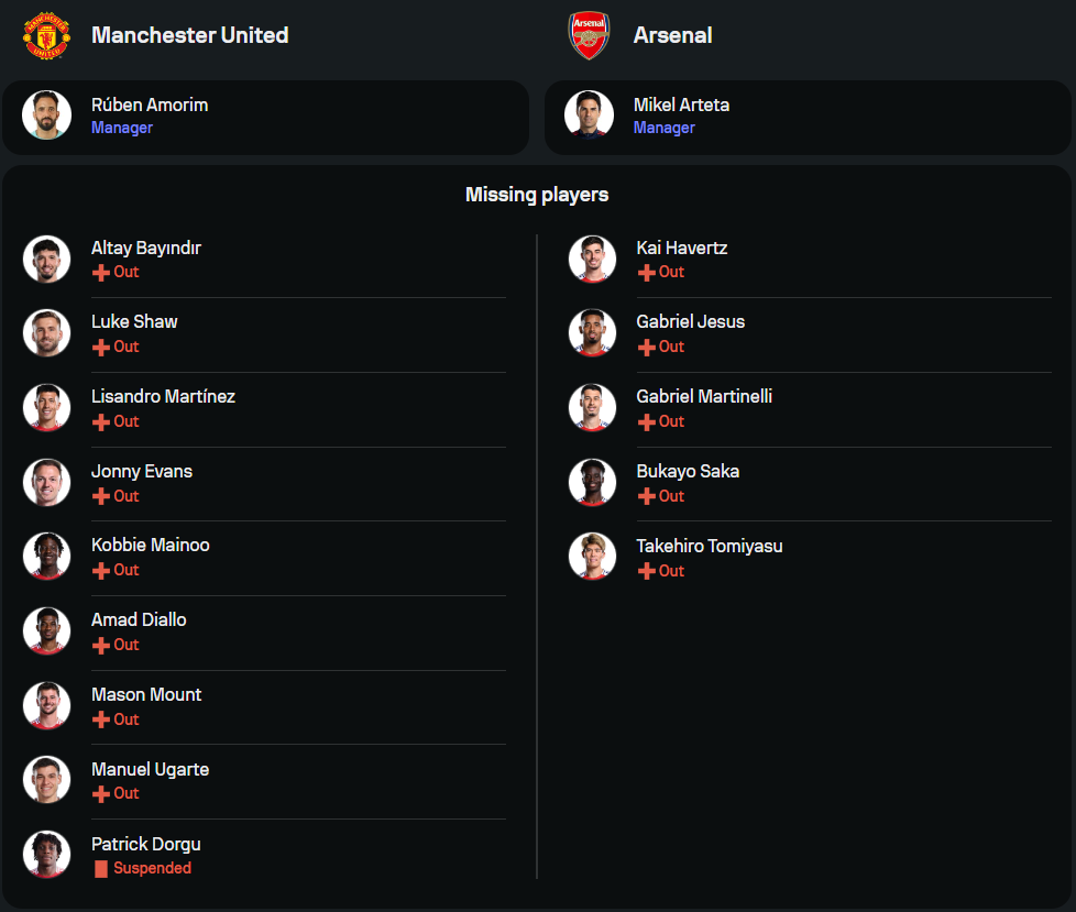 ทีมของ รูเบน อาโมริม เพิ่งจะเสมอกับ เรอัล โซเซียดาด 1-1 ในศึกยูโรป้าลีก ทำให้ต้องลงเล่นเกมนี้ด้วยความเหนื่อยล้า แถมพวกเขายังเจอปัญหาแข้งเจ็บเพียบ ไม่ว่าจะเป็น ลิซานโดร มาร์ติเนซ, เมสัน เมาท์, ค็อบบี้ ไมนู และ จอนนี่ อีแวนส์ นอกจากนี้ พาทริค ดอร์กู ยังติดโทษแบนอีกด้วย