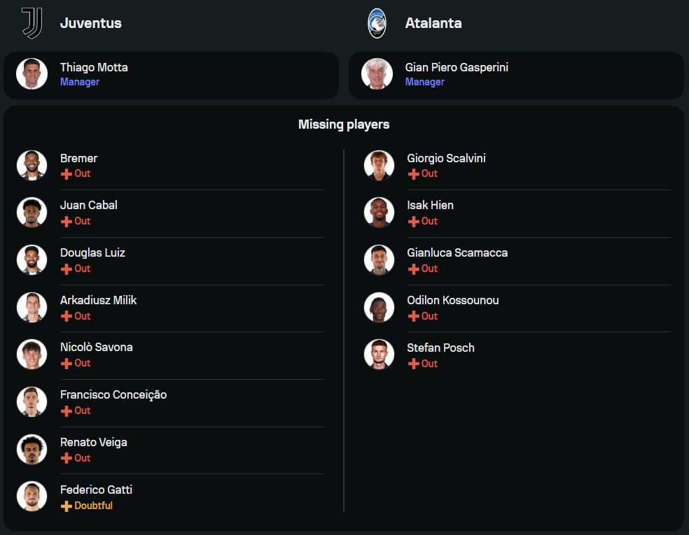 ฝั่ง อตาลันต้า ของ จาน ปิเอโร่ กัสเปรินี่ แม้จะไม่แพ้ในลีกมา 5 นัดติด แต่พวกเขายังต้องเจอปัญหาอาการบาดเจ็บของ โอดิลอน คอสซูนู, จอร์โจ้ สกัลวินี่, อิซัค ไฮน์, สเตฟาน พอช และ จานลูก้า สกามัคก้า