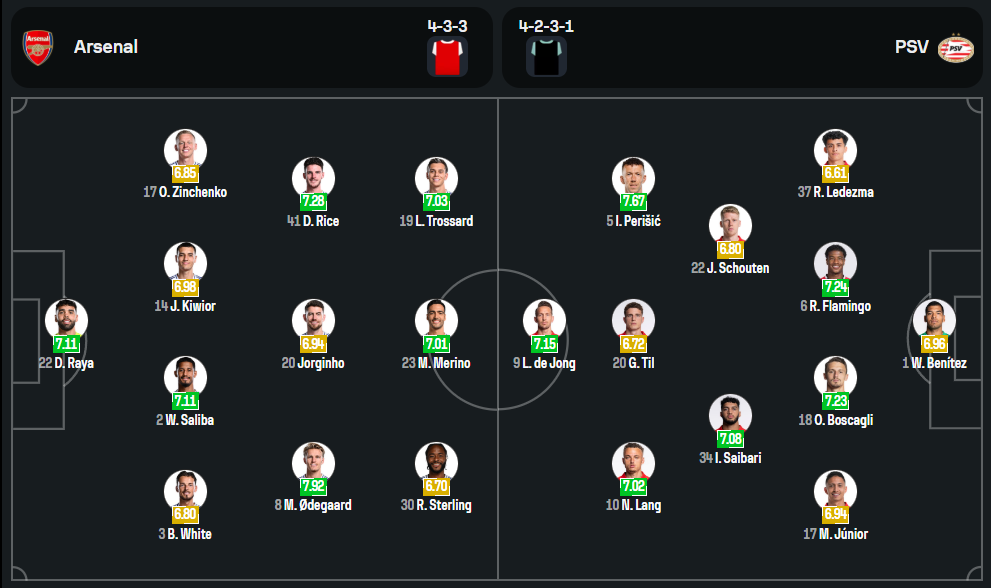 อาร์เซน่อล (4-3-3) : ดาบิด ราย่า – เบน ไวท์, วิลเลี่ยม ซาลิบา, ยาคุบ คิวิออร์, โอเล็กซานเดอร์ ซินเชนโก้ – มาร์ติน โอเดการ์ด, จอร์จินโญ่, ดีแคลน ไรซ์ – ราฮีม สเตอร์ลิ่ง, เลอันโดร ทรอสซาร์, คีแรน เทียร์นีย์