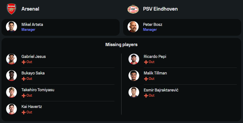 ทางฝั่งทีมเยือน พีเอสวี ของ ปีเตอร์ บอสซ์ ต้องเผชิญกับปัญหานักเตะบาดเจ็บเช่นกัน โดย ริคาร์โด้ เปปิ, มาลิก ทิลล์แมน และ เอสเมียร์ บายรัคตาเรวิช ต่างหมดสิทธิ์ลงสนามทั้งหมด อย่างไรก็ตาม ขุมกำลังที่เหลือพร้อมลุยเต็มที่ นำโดย ลุค เด ยอง เป็นศูนย์หน้าตัวเป้า คอยประสานงานกับ กุส ทิล และ อิวาน เปริซิช ในแผน 4-2-3-1