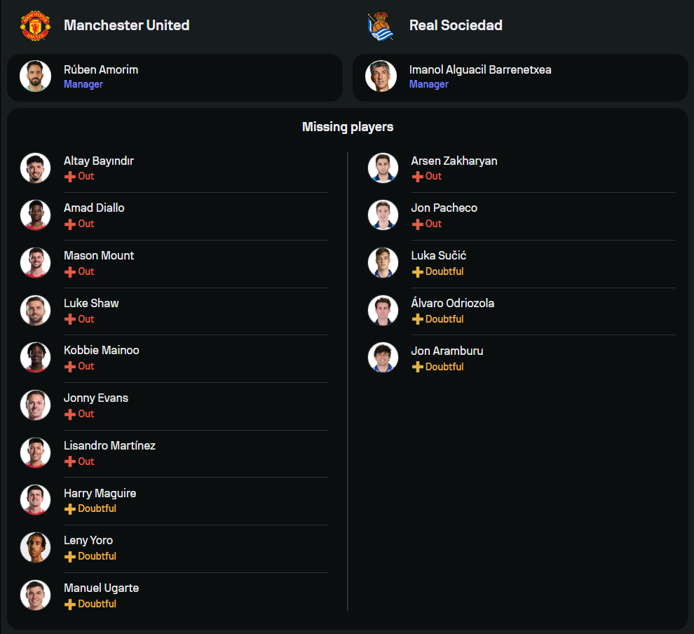 เจ้าบ้านมีปัญหาตัวหลักบาดเจ็บเพียบ ไล่ตั้งแต่ เมสัน เมาท์, ลิซานโดร มาร์ติเนซ, ลุค ชอว์, จอนนี่ อีแวนส์ รวมถึง อาหมัด ดิยัลโล่ และ ค็อบบี้ ไมนู ที่พลาดลงสนามทั้งหมด ส่วน แฮร์รี่ แม็คไกวร์, เลนี่ โยโร่ และ มานูเอล อูการ์เต้ ต้องรอเช็คความฟิต เกมนี้กุนซือ รูเบน อโมริม คงต้องเน้นรัดกุมและใช้ผู้เล่นที่เหลืออยู่ให้คุ้มค่าที่สุด นำโดย ราสมุส ฮอยลุนด์ ในแดนหน้า และ บรูโน่ แฟร์นานเดส เป็นหัวใจหลักของเกมรุก