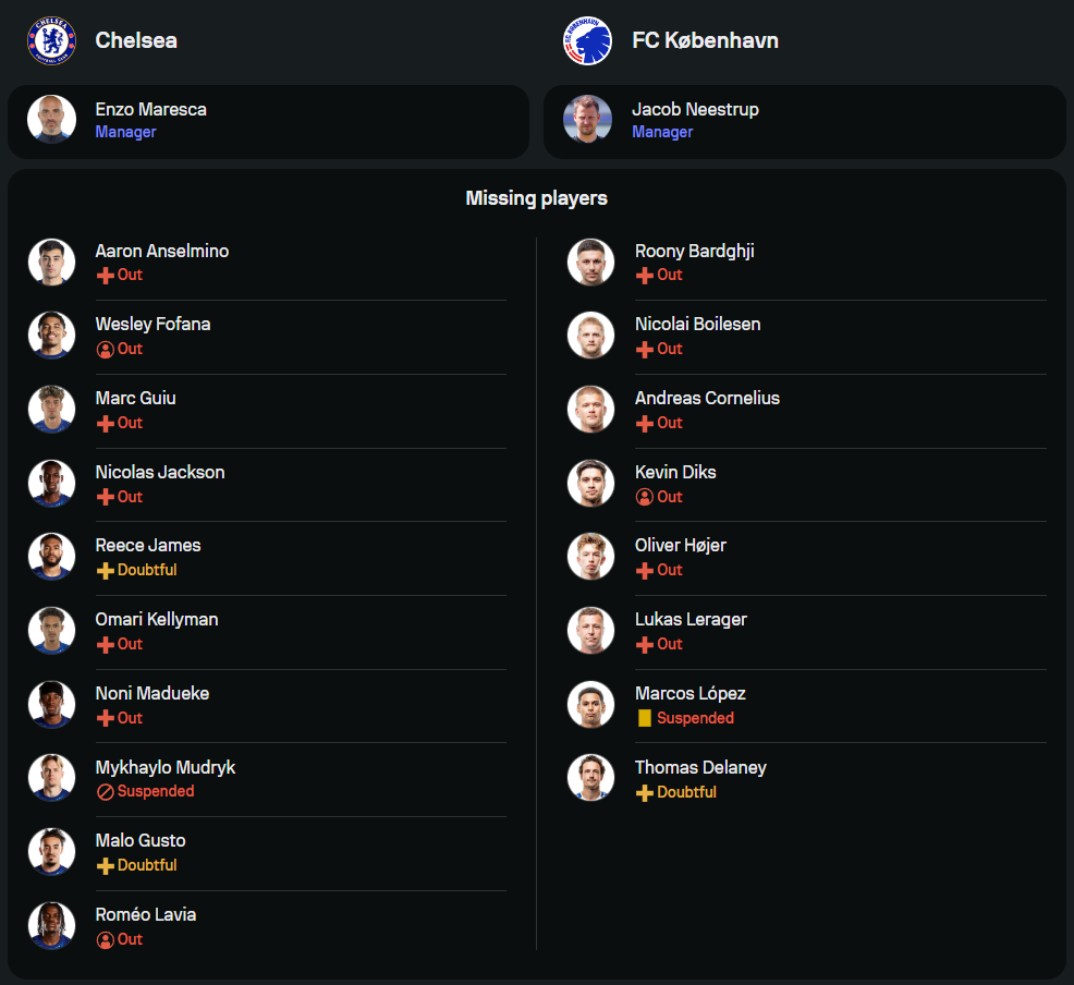 ทัพ สิงห์บลูส์ ของ เอนโซ่ มาเรสก้า ฟอร์มร้อนแรงในช่วงหลัง ชนะ 5 นัดติดรวมทุกรายการ โดยเฉพาะในลีกที่เพิ่งเฉือนเซาท์แฮมป์ตัน 1-0 ความพร้อมของทีมยังคงมีปัญหาผู้เล่นบาดเจ็บหลายราย ทั้ง นิโคลัส แจ็คสัน, โนนี่ มาดูเอเก้ และ มาร์ก กียู ที่ลงสนามไม่ได้แน่นอน รวมถึง มิคไฮโล มูดริค ที่ติดโทษแบน อย่างไรก็ตาม ทีมยังมีตัวหลักอย่าง โคล พัลเมอร์, คริสโตเฟอร์ เอ็นกุนกู และ เอ็นโซ่ เฟร์นานเดซ ที่พร้อมนำทัพในระบบ 4-2-3-1
