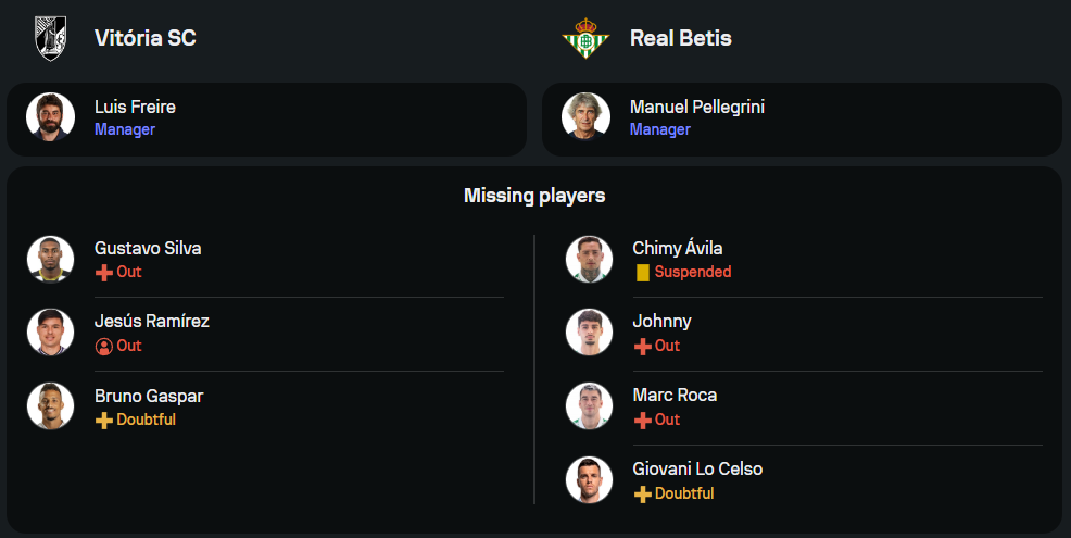 ทางฝั่งทีมเยือนของ มานูเอล เปเยกรินี่ ยังคงต้องเผชิญกับปัญหาตัวเจ็บหลายราย ไม่ว่าจะเป็น เอคตอร์ เบเยริน, ปาโบล ฟอร์นัลส์, มาร์ค โรก้า และ โจวานี่ โล เซลโซ่ ขณะที่ ชิมี่ อาวีล่า ติดโทษแบน ทำให้แนวรุกอาจต้องปรับแผนเล็กน้อย คาดว่าจะมาในระบบ 4-2-3-1 เช่นเดียวกัน โดยมี อิสโก้ เป็นตัวขับเคลื่อนเกมรุก ร่วมกับ อันโตนี่ และ พอล ฟอร์นัลส์ สนับสนุนหน้าเป้า เซดริก บากัมบู ที่จะทำหน้าที่ล่าตาข่าย