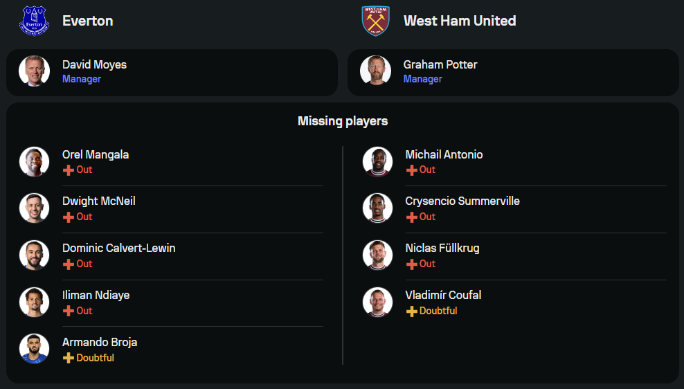 ลูกทีมของ เดวิด มอยส์ ฟอร์มการเล่นช่วงหลังยังไม่แพ้ใครใน 5 นัดหลังสุด แต่ปัญหาสำคัญคือการจบสกอร์ที่ยังขาดความเฉียบขาด และแนวรับที่ยังมีช่องโหว่อยู่บ้าง ความพร้อมของทีมก่อนลงสนาม พวกเขาต้องขาดนักเตะตัวหลักหลายราย ได้แก่ โอเรล ม็องกาล่า, โดมินิก คัลเวิร์ต-เลวิน, ดไวจ์ท แม็คนีล, อาร์มันโด้ โบรย่า และ อิลิมัน เอ็นดิอาย ที่บาดเจ็บทั้งหมด
