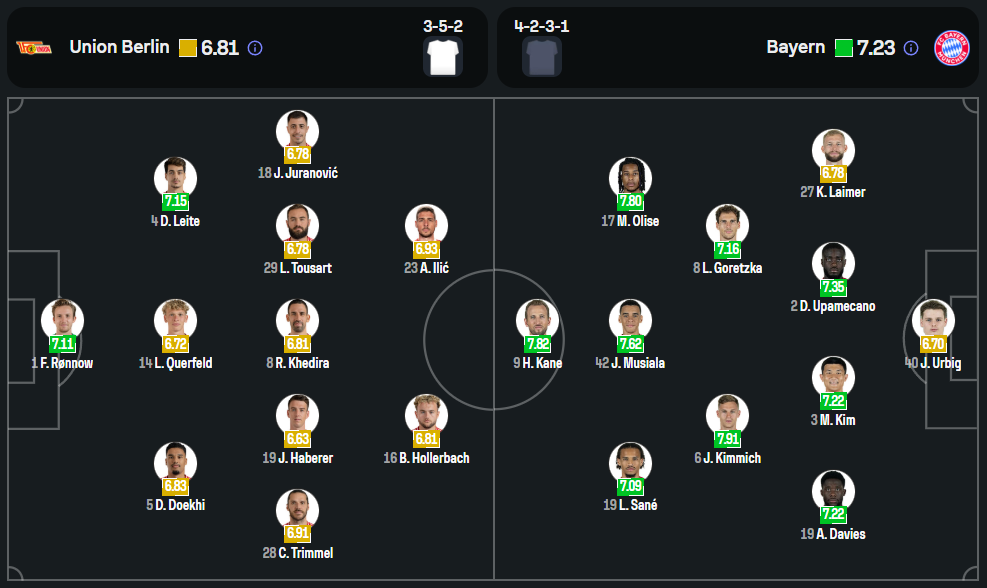 โยนาส อูร์บิก – คอนราด ไลเมอร์, ดาโยต์ อูปาเมกาโน่, คิม มิน แจ, อัลฟองโซ่ เดวี่ส์ – โยชัว คิมมิค, เลออน โกเร็ตซ์ก้า – ไมเคิ่ล โอลิเซ่, โธมัส มุลเลอร์, เลรอย ซาเน่ – แฮร์รี่ เคน