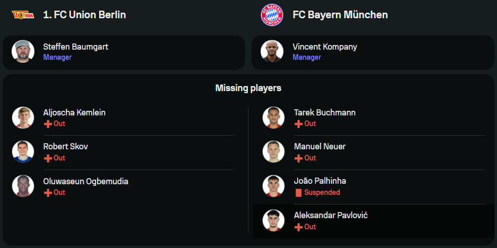 “เสือใต้” ของ แว็งซ็องต์ ก็อมปานี ฟอร์มแรงต่อเนื่องจากการเอาชนะ เลเวอร์คูเซ่น 2-0 ในเกมยุโรป นอกจากนี้ พวกเขายังต้องการ 3 แต้มเพื่อรักษาตำแหน่งจ่าฝูง อย่างไรก็ตาม พวกเขาจะขาด เชา เปาลินญ่า ที่ติดโทษแบน และ มานูเอล นอยเออร์, ทาเร็ค บัคมันน์, อเล็คซานดาร์ พาฟโลวิค ที่ยังไม่หายเจ็บ ตัวแบน: กองกลาง: เชา เปาลินญ่า ตัวเจ็บ: ผู้รักษาประตู: มานูเอล นอยเออร์ กองหลัง: ทาเร็ค บัคมันน์ กองกลาง: อเล็คซานดาร์ พาฟโลวิค