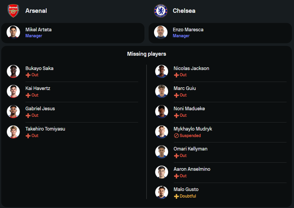เชลซี ทางฝั่งทีมเยือนของ เอนโซ่ มาเรสก้า แม้ผลงานในช่วงหลังจะเริ่มกลับมาดีขึ้นจากการคว้าชัย 4 นัดหลังสุด แต่ปัญหานักเตะบาดเจ็บยังคงเป็นอุปสรรคสำคัญ โดยพวกเขาจะไม่มี นิโคลัส แจ็คสัน, มาร์ก กียู, โนนี่ มาดูเอเก้ และ โรเมโอ ลาเวีย รวมไปถึง มีไคโล มูดริค ที่ติดโทษแบน คาดว่าทีมจะมาในระบบ 4-2-3-1 โดยมี เปโดร เนโต้ เป็นหน้าเป้าล่าสกอร์ โดยมี โคล พาลเมอร์, คริสโตเฟอร์ เอ็นกุนกู และ เจดอน ซานโช่ คอยสร้างสรรค์เกมรุก