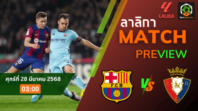 ในค่ำคืนแห่งความเดือดที่รอคอย ศึกลา ลีกา สเปน กลับมาระเบิดความมันส์อีกครั้งในเกมตกค้างสุดสำคัญที่สนามโอลิมปิก ลุยส์ กอมปานีส์ เมื่อ บาร์เซโลน่า จ่าฝูงผู้ลุ้นคว้าแชมป์จะเปิดรังปะทะกับ โอซาซูน่า ทีมแกร่งจากแดนนาบาร์ร่า โดยการแข่งขันนี้จะเริ่มขึ้นในคืนวันศุกร์ที่ 28 มีนาคม 2568 เวลา 03.00 น. ตามเวลาไทย ถือเป็นหนึ่งในคู่เด็ดของ ตารางบอลวันนี้ ที่ห้ามพลาดเด็ดขาด เพราะหากทัพอาซูลกราน่าเก็บสามแต้มได้ จะหนีห่างอันดับ 2 อย่างเรอัล มาดริดออกไปถึง 3 คะแนน และอาจเปลี่ยนโฉมหน้าตารางคะแนนทันที