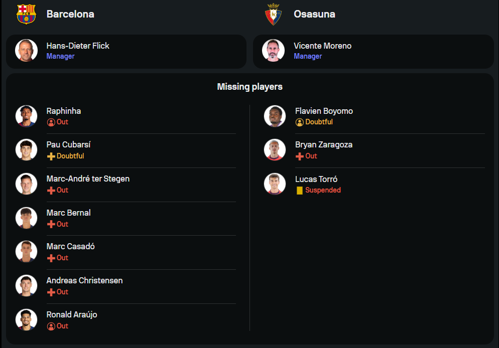ด้าน ของ โอซาซูน่า บิเซนเต้ โมเรโน่ ยังต้องเจอปัญหานักเตะไม่สมบูรณ์เช่นกัน โดยเกมนี้จะไม่มี ลูคัส ตอร์โร่ กองกลางตัวเก่งที่ติดโทษแบน ขณะที่ ไบรอัน ซาราโกซา บาดเจ็บชวดลงช่วยทีมแน่นอน ส่วน ฟลาเวียง โบโยโม่ แม้จะกลับมาจากทีมชาติแคเมอรูนแล้วแต่ยังต้องเช็กความฟิตอีกครั้ง อย่างไรก็ตามแนวรุกยังพอฝากความหวังได้จาก อันเต้ บูดิเมียร์, ราอูล การ์เซีย และ มอยเซส โกเมซ ที่พร้อมล่าตาข่ายในแผน 4-3-3